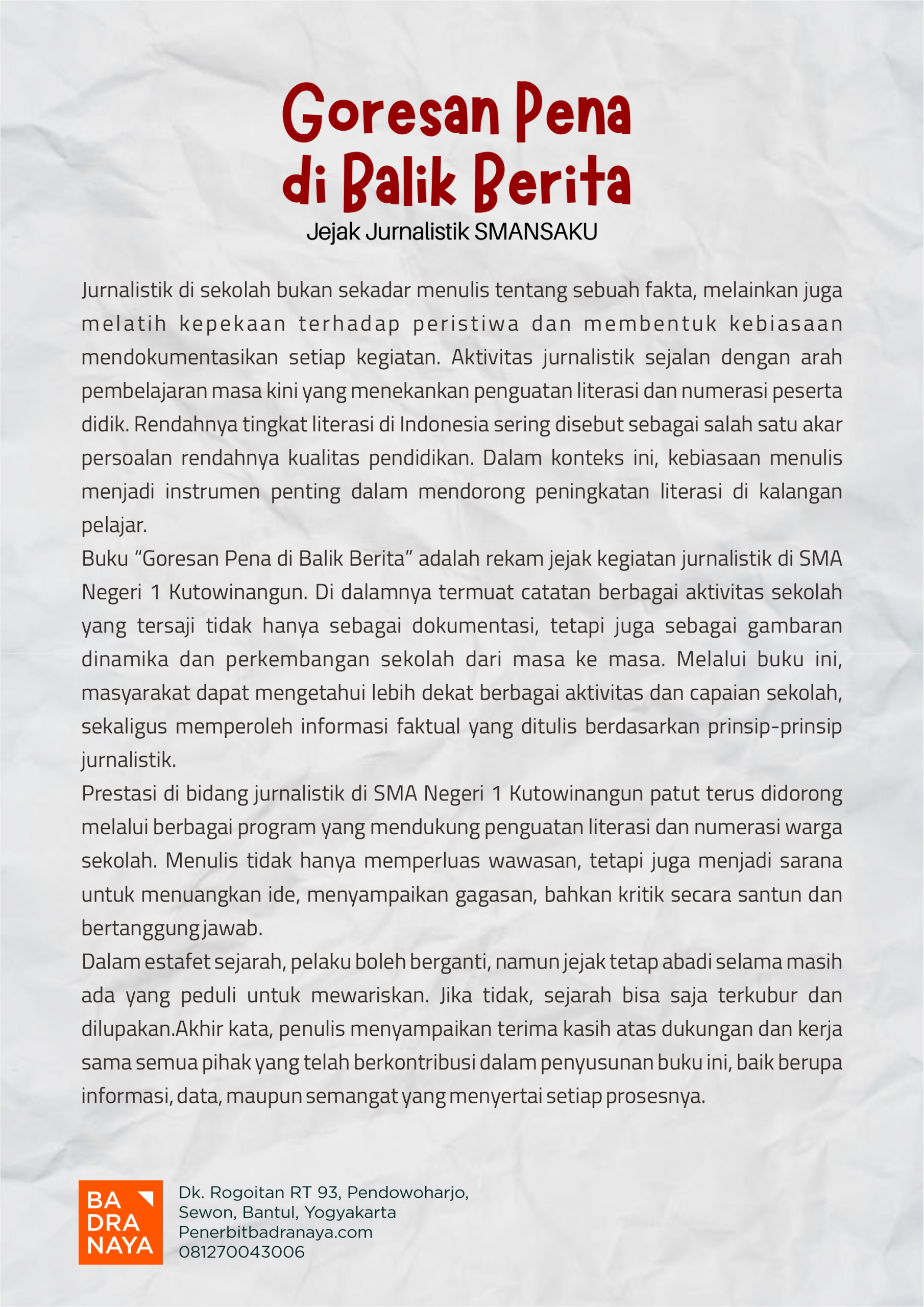 BADRANAYA adalah penerbit yang memberikan ruang bagi penulis lokal, mahasiswa, dan kreator untuk menerbitkan karya mereka.